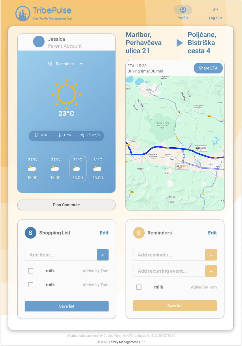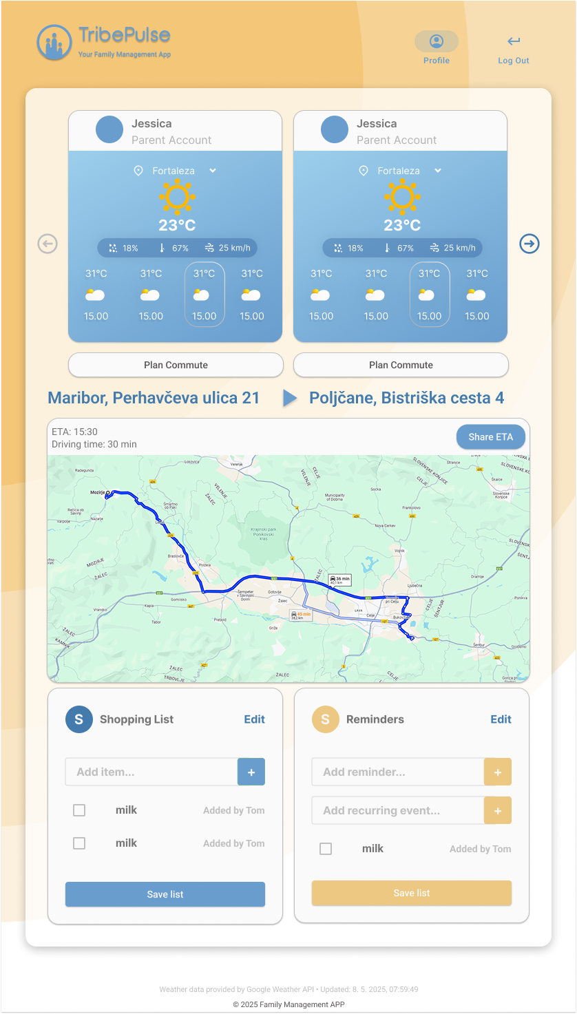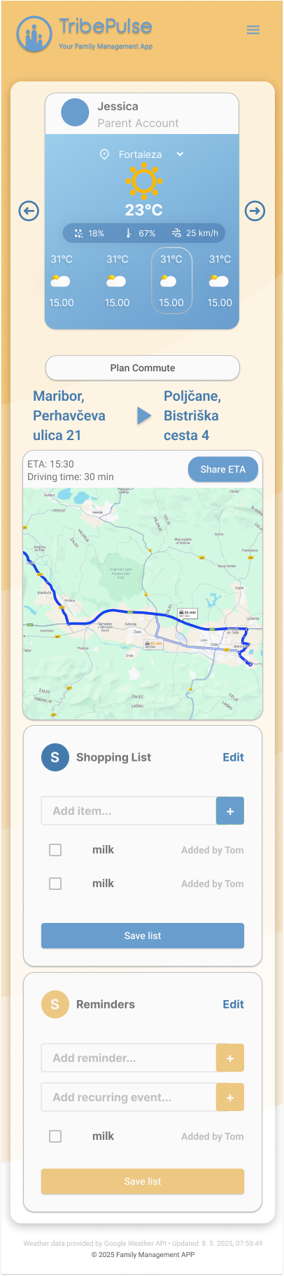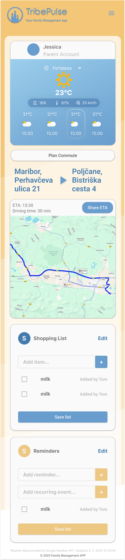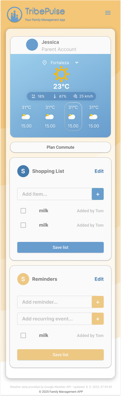 This redesign brings TribePulse’s mission into sharp focus: to simplify everyday family coordination through a clean, card-based interface. From the moment you land on the dashboard, you’re greeted with personalized weather at a glance, an interactive commute planner, and shared lists that encourage collaboration. By pairing generous white space with a warm color palette and a friendly family-silhouette logo, the new design feels both welcoming and intuitive to every member, parent or child, to jump right in.