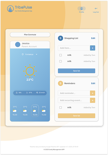 The TribePulse dashboard delivers a streamlined, mobile-first experience that prioritizes clarity and everyday utility. Designed to adapt seamlessly across screen sizes, the interface presents essential tools such as weather, commute planning, shared shopping lists, and reminders in a structured, modular layout. Each element is visually distinct yet cohesive, supporting quick interactions while remaining accessible on both mobile and desktop. The design emphasizes real-time relevance and personalization, helping users stay organized with minimal effort, whether at home or on the go.
